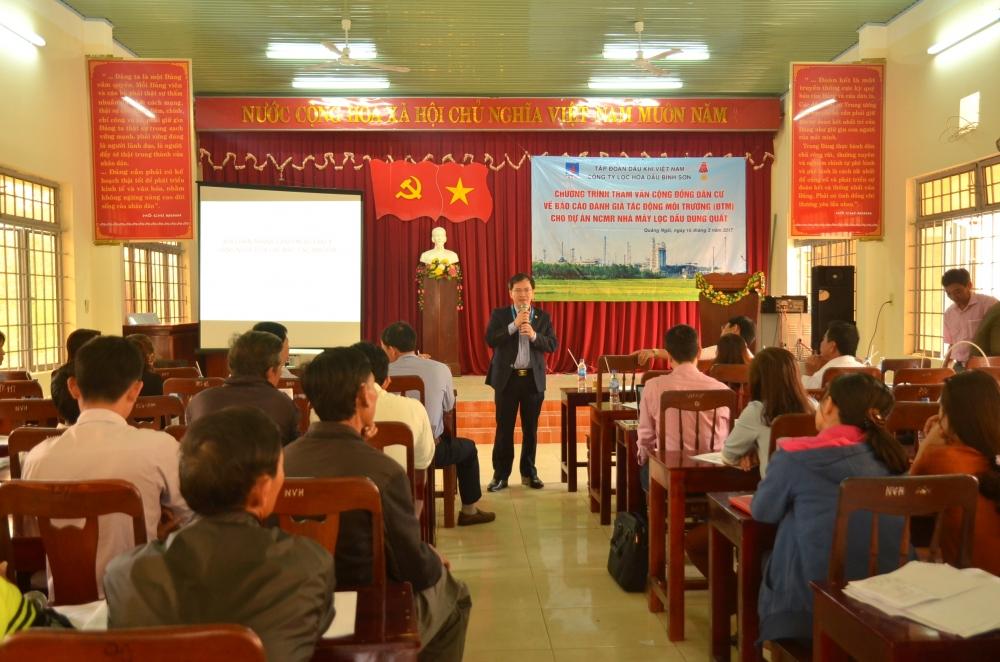 Trong hai ngày 16 và 17/2/2017, Công ty BSR phối hợp với Ban quản lý dự án Nâng cấp, mở rộng NMLD Dung Quất tổ chức chương trình tham vấn cộng đồng dân cư về báo cáo tác động môi trường cho dự án Nâng cấp, mở rộng Nhà máy tại xã Bình Trị và Bình Thuận, Bình Sơn, Quảng Ngãi.