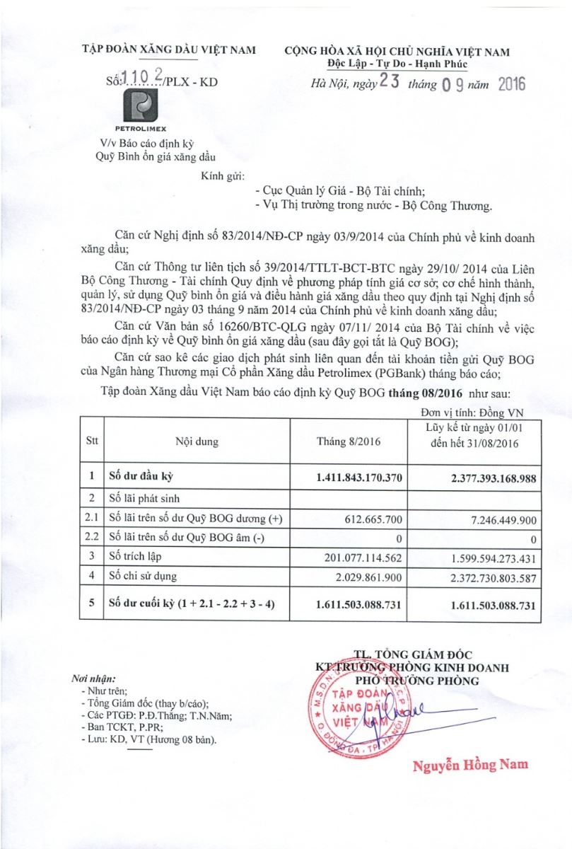 Tập đoàn Xăng dầu Việt Nam vừa có báo cáo về Quỹ Bình ổn giá định kỳ tháng 8 năm 2016