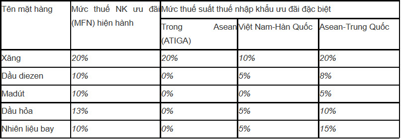 Trong 11 Hiệp định song phương, khu vực, có một số Hiệp định, mặt hàng xăng dầu thuộc danh mục “loại trừ” (không có nghĩa vụ cắt giảm), nhưng có một số Hiệp định đã được cắt giảm với mức thuế nhập khẩu ưu đãi đặc biệt năm 2016 như sau: