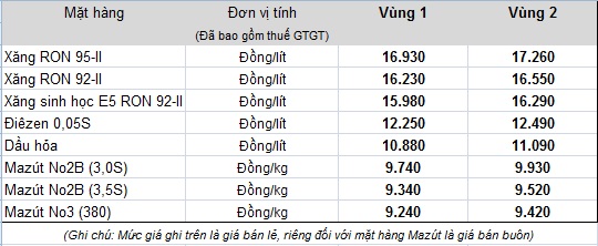 Mức giá mới có hiệu lực từ thời điểm 15 giờ 00 ngày 20 tháng 09 năm 2016 cho đến khi có thông cáo báo chí (TCBC) mới.