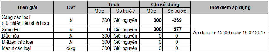 Theo văn bản số 1315/BCT-TTTN của Bộ Công Thương về việc điều hành kinh doanh xăng dầu, mức trích lập và chi sử dụng Quỹ bình ổn giá xăng dầu (BOG) từ 15 giờ 00 ngày 18.02.2017, cụ thể như sau: