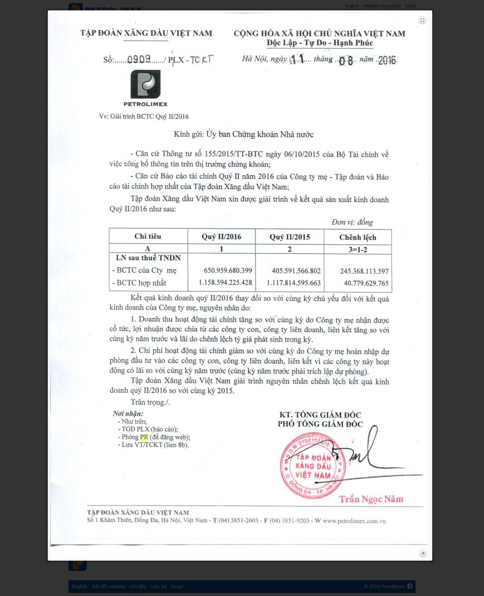 Tập đoàn Xăng dầu Việt Nam giải trình báo cáo tài chính Quý II⁄2016