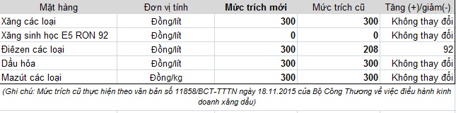 Theo văn bản số 12401/BCT-TTTN của Bộ Công Thương về việc điều hành kinh doanh xăng dầu, mức trích sử dụng Quỹ bình ổn giá xăng dầu (BOG) từ 15 giờ 00 ngày 03/12/2015 cụ thể như sau:
