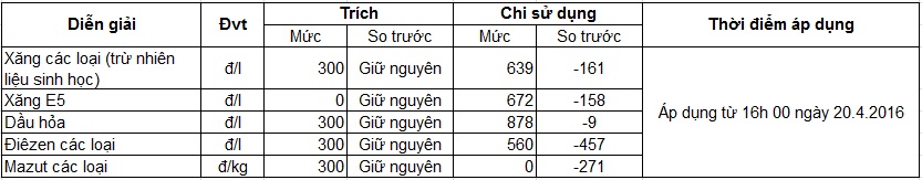 Theo văn bản số 3047/BCT-TTTN của Bộ Công Thương về việc điều hành kinh doanh xăng dầu, mức trích lập và chi sử dụng Quỹ bình ổn giá xăng dầu (BOG) từ 16 giờ 00 ngày 20.4.2016, cụ thể như sau: