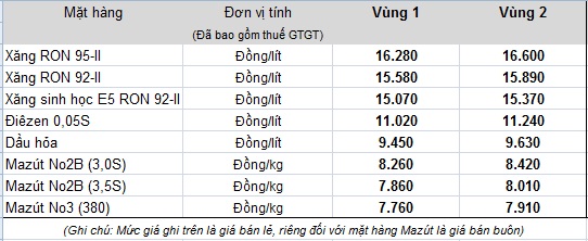 Mức giá mới có hiệu lực từ thời điểm 15 giờ 00 ngày 05 tháng 5 năm 2016 cho đến khi có thông cáo báo chí (TCBC) mới.
