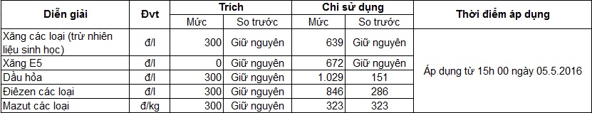 Theo văn bản số 3835/BCT-TTTN của Bộ Công Thương về việc điều hành kinh doanh xăng dầu, mức trích lập và chi sử dụng Quỹ bình ổn giá xăng dầu (BOG) từ 15 giờ 00 ngày 05.5.2016, cụ thể như sau: