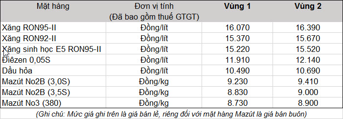 Mức giá mới có hiệu lực từ thời điểm 15 giờ 30 ngày 19 tháng 8 năm 2016 cho đến khi có thông cáo báo chí (TCBC) mới.
