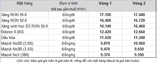 Mức giá mới có hiệu lực từ thời điểm 16 giờ 30 ngày 05 tháng 10 năm 2016 cho đến khi có thông cáo báo chí (TCBC) mới.