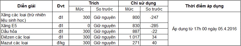 Theo văn bản số 2974/BCT-TTTN của Bộ Công Thương về việc điều hành kinh doanh xăng dầu, mức trích chi sử dụng Quỹ bình ổn giá xăng dầu (BOG) từ 17 giờ 00 ngày 05.4.2016, cụ thể như sau: