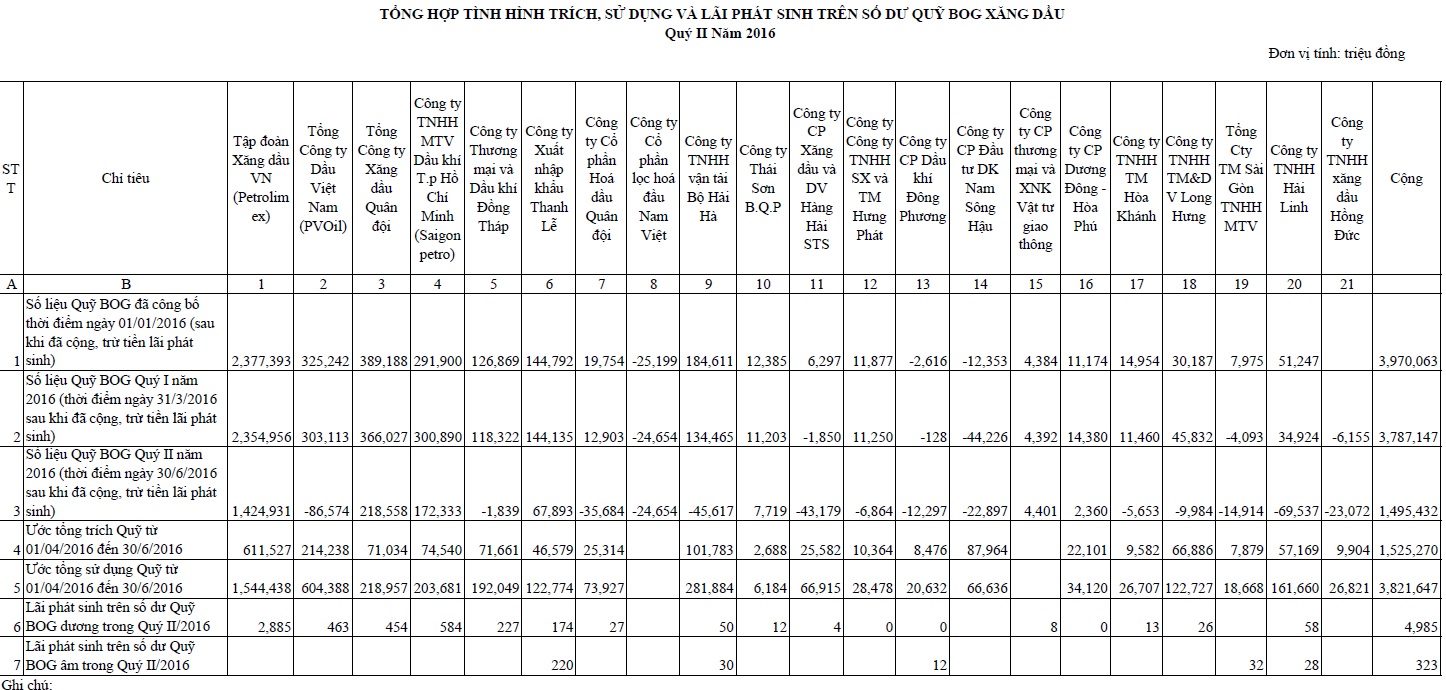 Thực hiện quy định tại Nghị định số 83⁄2014⁄NĐ-CP ngày 03⁄9⁄2014 của Chính phủ về kinh doanh xăng dầu; Cục Quản lý Giá (Bộ Tài chính) đã thông báo về tình hình trích lập, sử dụng và lãi phát sinh trên số dư Quỹ BOG Xăng dầu Quý II năm 2016 của các thương nhân đầu mối kinh doanh xăng dầu.