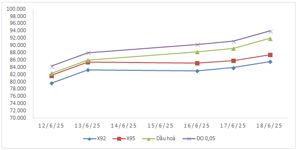 Bình quân giá thành phẩm xăng dầu thế giới giữa kỳ điều hành giá ngày 12/6/2025 và kỳ điều hành ngày 19/6/2025 là: 83,088 USD/thùng xăng RON92 dùng để pha chế xăng E5RON92 (tăng 6,340 USD/thùng, tương đương tăng 8,26%); 85,128 USD/thùng xăng RON95 (tăng 6,464 USD/thùng, tương đương tăng 8,22%); 87,578 USD/thùng dầu hỏa (tăng 7,838 USD/thùng, tương đương tăng 9,83%); 89,556 USD/thùng dầu điêzen 0,05S (tăng 8,050 USD/thùng, tương đương tăng 9,88%); 476,846 USD/tấn dầu mazut 180CST 3,5S (tăng 40,694 USD/tấn, tương đương tăng 9,33%).