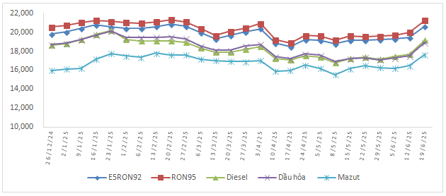 Biến động giá bán xăng dầu trong nước năm 2025 (26/12/2024 đến 19/6/2025)