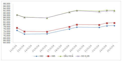 Bình quân giá thành phẩm xăng dầu thế giới giữa kỳ điều hành giá ngày 20/02/2026 và kỳ điều hành ngày 26/02/2026 là: 78,238 USD/thùng xăng RON92 dùng để pha chế xăng E5RON92 (tăng 4,668 USD/thùng, tương đương tăng 6,34%); 80,628 USD/thùng xăng RON95 (tăng 4,903 USD/thùng, tương đương tăng 6,47%); 92,405 USD/thùng dầu hỏa (tăng 4,500 USD/thùng, tương đương tăng 5,12%); 91,673 USD/thùng dầu điêzen 0,05S (tăng 3,918 USD/thùng, tương đương tăng 4,46%); 427,860 USD/tấn dầu mazut 180CST 3,5S (giảm 7,793 USD/tấn, tương đương giảm 1,79%).