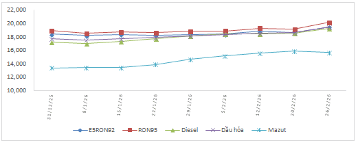 Biến động giá bán xăng dầu trong nước năm 2026 (31/12/2025 đến 26/02/2026)