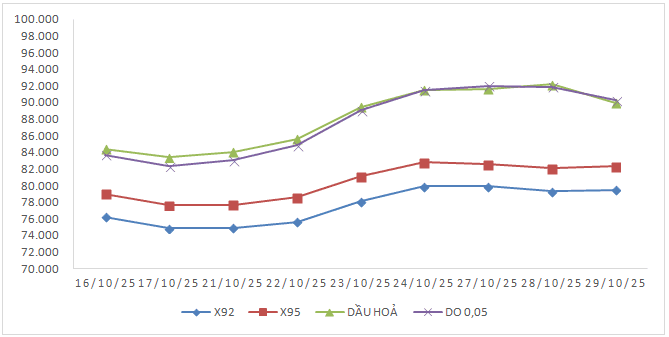 Bình quân giá thành phẩm xăng dầu thế giới giữa kỳ điều hành giá ngày 23/10/2025 và kỳ điều hành ngày 30/10/2025 là: 79,326 USD/thùng xăng RON92 dùng để pha chế xăng E5RON92 (tăng 3,951 USD/thùng, tương đương tăng 5,24%); 82,158 USD/thùng xăng RON95 (tăng 3,955 USD/thùng, tương đương tăng 5,06%); 90,928 USD/thùng dầu hỏa (tăng 6,573 USD/thùng, tương đương tăng 7,79%); 90,942 USD/thùng dầu điêzen 0,05S (tăng 7,459 USD/thùng, tương đương tăng 8,93%); 387,642 USD/tấn dầu mazut 180CST 3,5S (tăng 19,084 USD/tấn, tương đương tăng 5,18%).