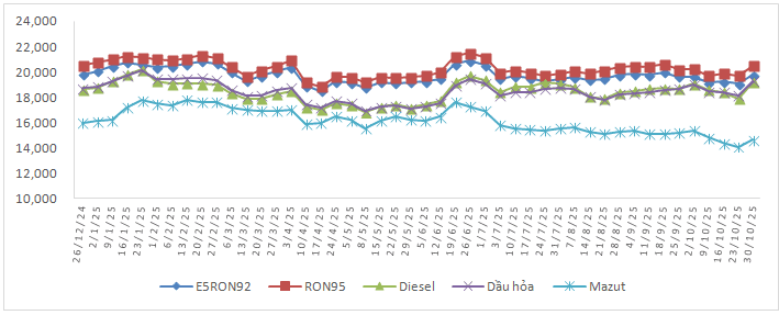 Biến động giá bán xăng dầu trong nước năm 2025 (26/12/2024 đến 30/10/2025)