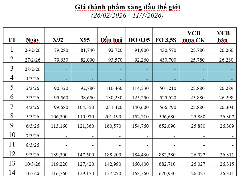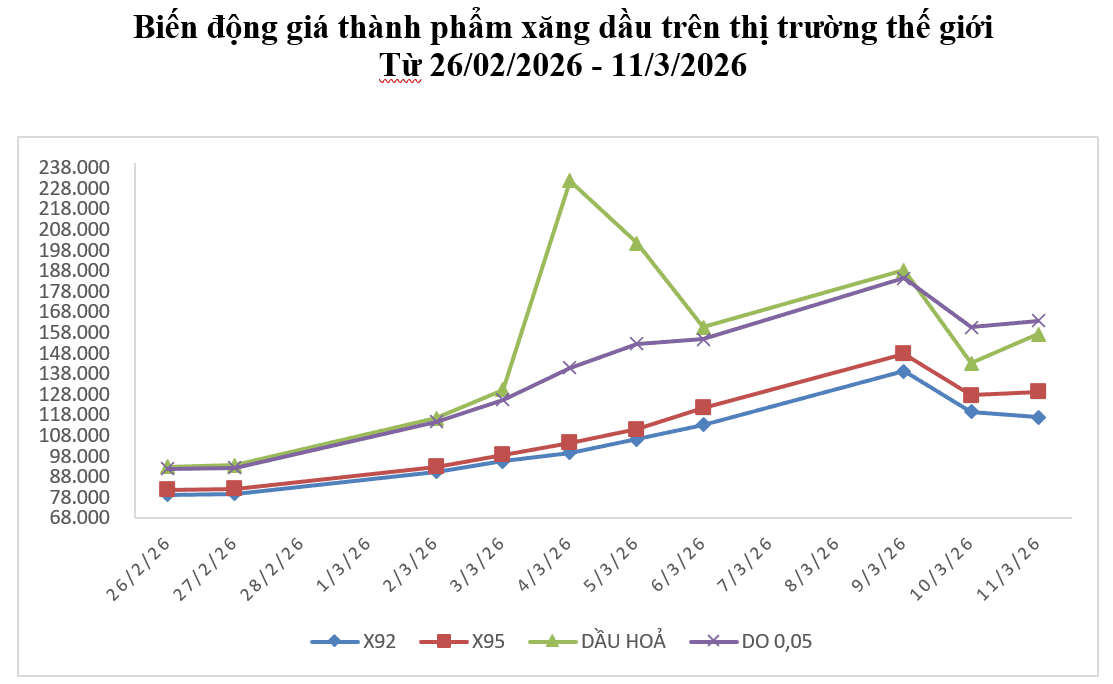 Giá thành phẩm xăng dầu thế giới ngày 11/3/2026 so với ngày 10/3/2026 là: 116,760 USD/thùng xăng RON92 dùng để pha chế xăng E5RON92 (giảm 2,460 USD/thùng, tương đương giảm 2,06%); 129,170 USD/thùng xăng RON95 (tăng 1,750 USD/thùng, tương đương tăng 1,37%); 157,270 USD/thùng dầu hỏa (tăng 14,280 USD/thùng, tương đương tăng 9,99%); 163,560 USD/thùng dầu điêzen 0,05S (tăng 3,160 USD/thùng, tương đương tăng 1,97%); 670,930 USD/tấn dầu mazut 180CST 3,5S (giảm 11,780 USD/tấn, tương đương giảm 1,73%).