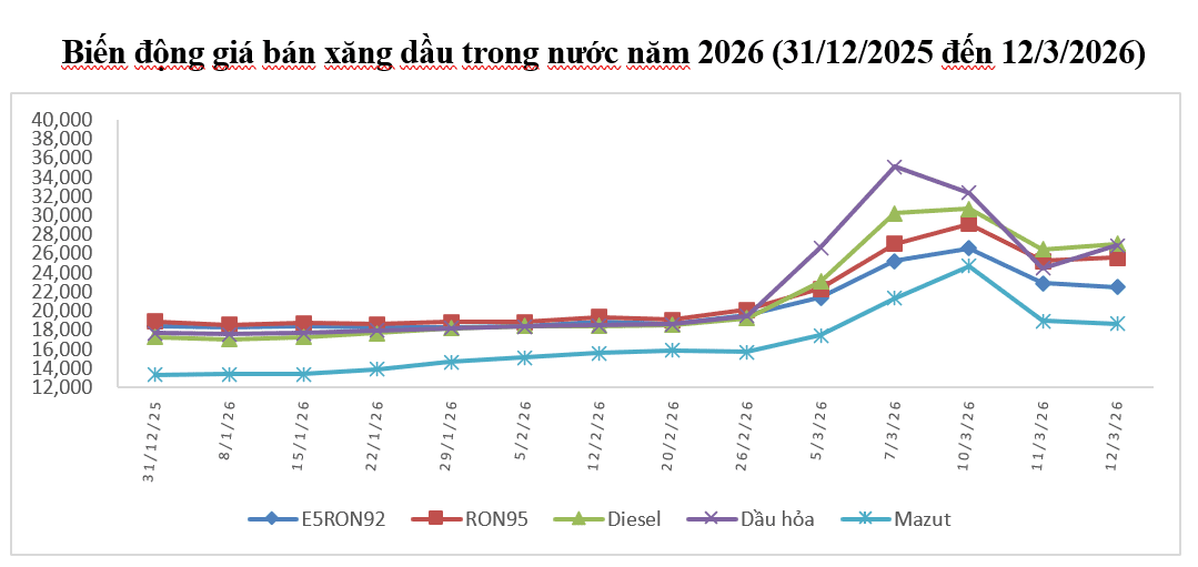 Tại lần thông báo giá xăng dầu hôm nay, ngày 12/3/2026, liên Bộ Công Thương - Tài chính quyết định tiếp tục áp dụng phương án điều hành giá xăng dầu kết hợp giữa việc bình ổn giá xăng dầu và điều chỉnh giá xăng dầu trong nước nhằm ổn định giá xăng dầu, đảm bảo giá xăng dầu trong nước phản ánh đúng xu hướng giá xăng dầu thế giới; tiếp tục duy trì mức chênh lệch giá giữa xăng sinh học E5RON92 và xăng không chì RON95 ở mức hợp lý để khuyến khích sử dụng nhiên liệu sinh học; bảo đảm hài hòa lợi ích giữa các chủ thể tham gia thị trường. Cụ thể như sau: