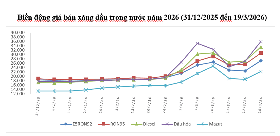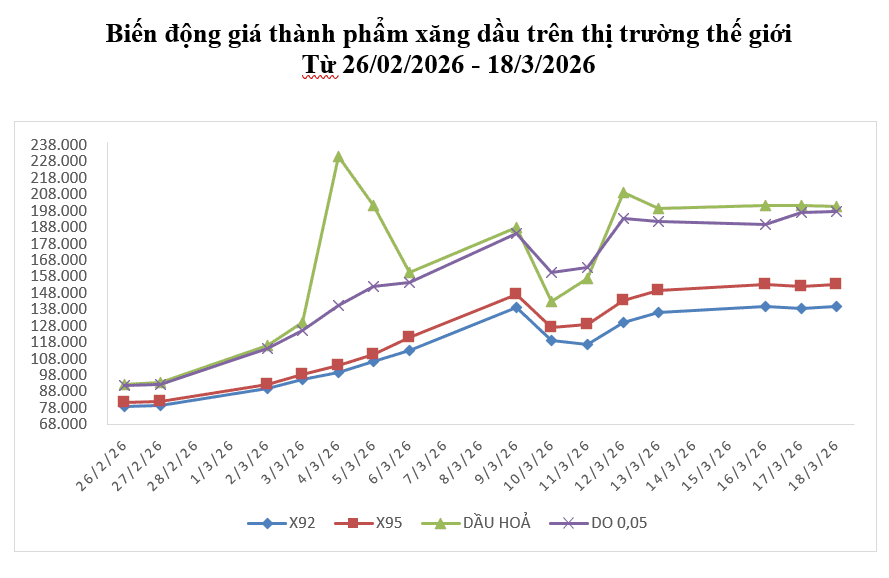 Bình quân giá thành phẩm xăng dầu thế giới giữa kỳ điều hành giá ngày 12/3/2026 và kỳ điều hành ngày 19/3/2026 là: 137,072 USD/thùng xăng RON92 dùng để pha chế xăng E5RON92 (tăng 20,312 USD/thùng, tương đương tăng 17,40%); 150,392 USD/thùng xăng RON95 (tăng 21,222 USD/thùng, tương đương tăng 16,43%); 202,556 USD/thùng dầu hỏa (tăng 45,286 USD/thùng, tương đương tăng 28,80%); 193,998 USD/thùng dầu điêzen 0,05S (tăng 30,438 USD/thùng, tương đương tăng 18,61%); 759,122 USD/tấn dầu mazut 180CST 3,5S (tăng 88,192 USD/tấn, tương đương tăng 13,14%).