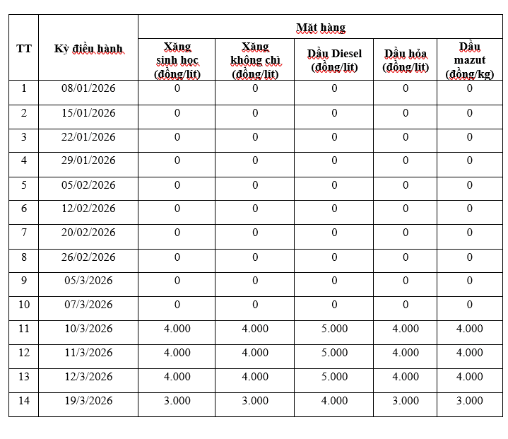 - Điều chỉnh giá bán các mặt hàng xăng dầu: Do thương nhân đầu mối kinh doanh xăng dầu, thương nhân phân phối xăng dầu quy định nhưng không sớm hơn 23 giờ 00’ ngày 19 tháng 3 năm 2026.