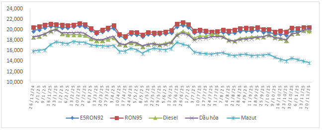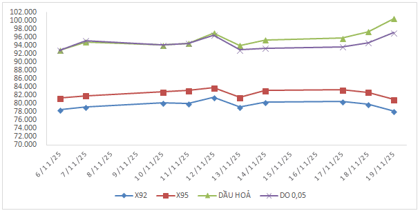 Bình quân giá thành phẩm xăng dầu thế giới giữa kỳ điều hành giá ngày 13/11/2025 và kỳ điều hành ngày 20/11/2025 là: 79,614 USD/thùng xăng RON92 dùng để pha chế xăng E5RON92 (giảm 0,248 USD/thùng, tương đương giảm 0,31%); 82,352 USD/thùng xăng RON95 (giảm 0,222 USD/thùng, tương đương giảm 0,27%); 96,570 USD/thùng dầu hỏa (tăng 1,942 USD/thùng, tương đương tăng 2,05%); 94,346 USD/thùng dầu điêzen 0,05S (giảm 0,272 USD/thùng, tương đương giảm 0,29%); 355,608 USD/tấn dầu mazut 180CST 3,5S (giảm 11,964 USD/tấn, tương đương giảm 3,25%).
