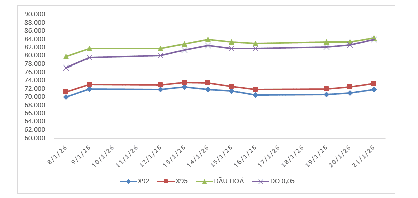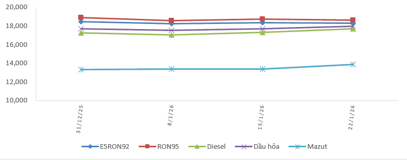 Biến động giá bán xăng dầu trong nước năm 2026 (31/12/2025 đến 22/01/2026)