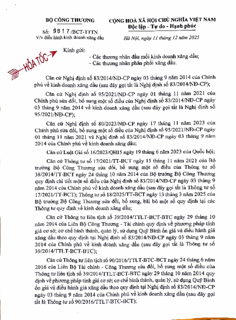 | Tiêu đề văn bản | Công văn về việc điều hành kinh doanh xăng dầu ngày 11/12 | ||