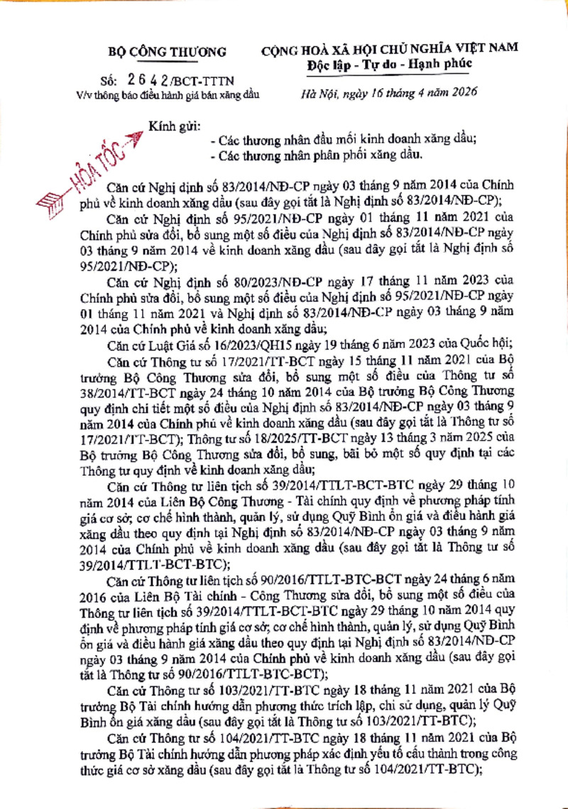 | Tiêu đề văn bản | Công văn về việc điều hành kinh doanh xăng dầu ngày 16/4/2026 | ||