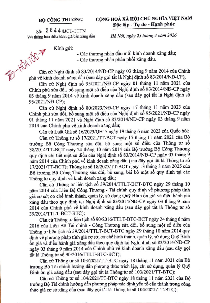 | Tiêu đề văn bản | Công văn về việc điều hành kinh doanh xăng dầu ngày 23/4/2026 | ||