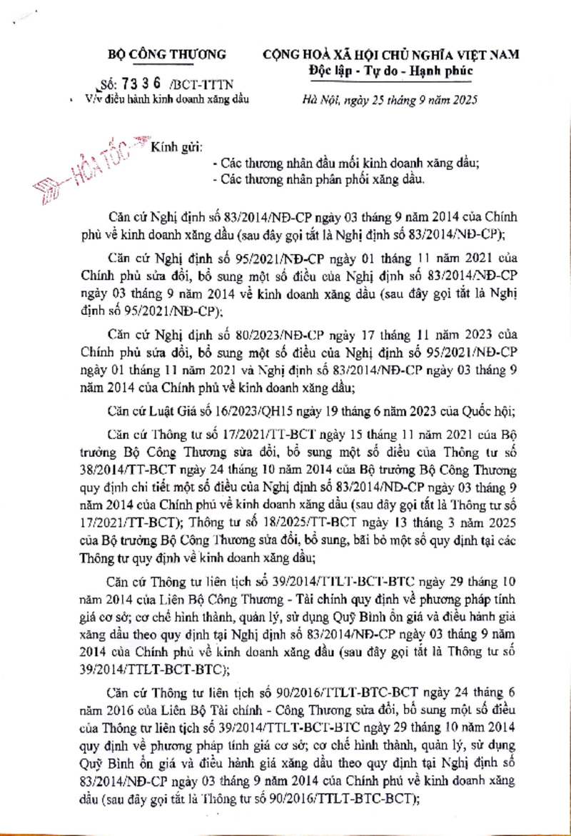 | Tiêu đề văn bản | Công văn về việc điều hành kinh doanh xăng dầu ngày 25/9 | ||