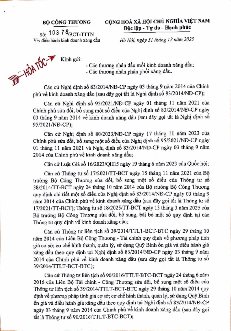 | Tiêu đề văn bản | Công văn về việc điều hành kinh doanh xăng dầu ngày 31/12 | ||