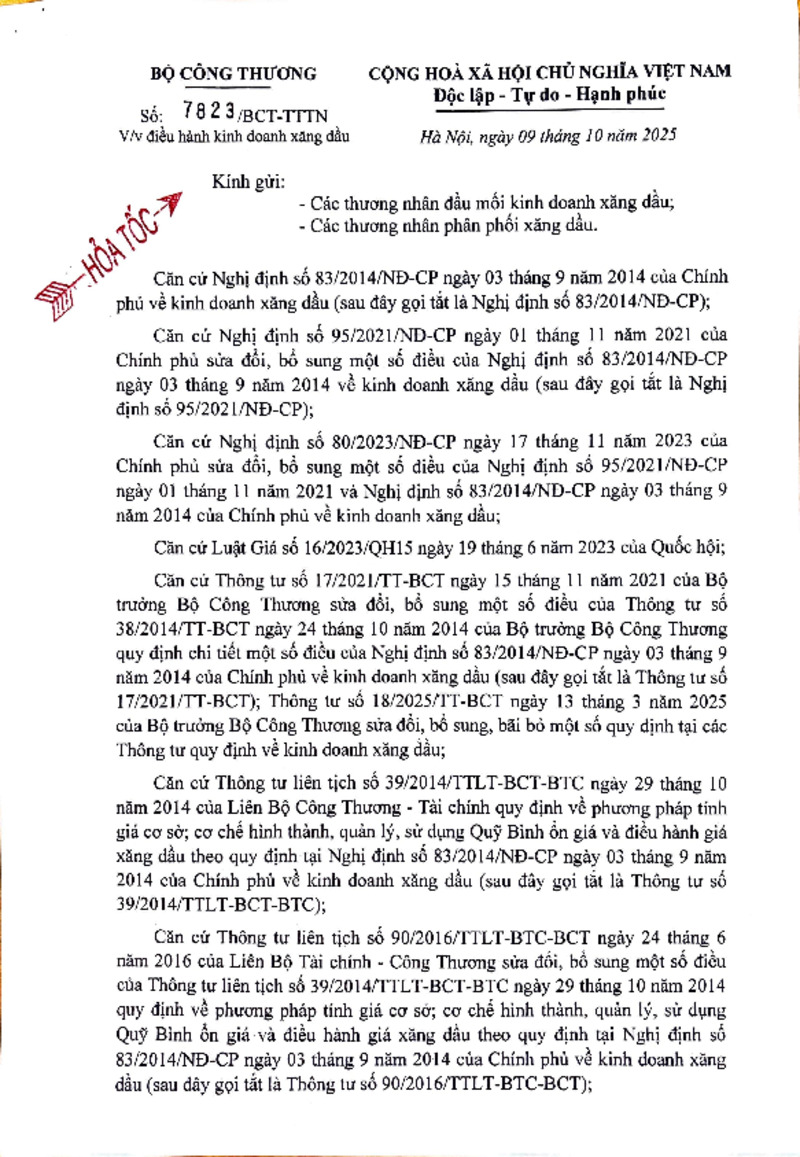 | Tiêu đề văn bản | Công văn về việc điều hành kinh doanh xăng dầu ngày 9/10 | ||