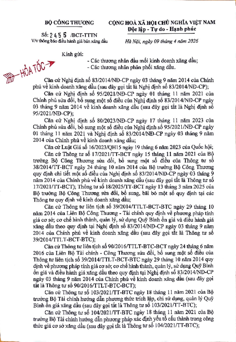 | Tiêu đề văn bản | Công văn về việc điều hành kinh doanh xăng dầu ngày 9/4/2026 | ||