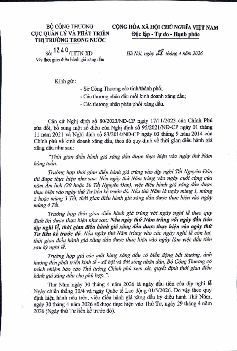 | Tiêu đề văn bản | Công văn về việc thời gian điều hành giá xăng dầu | ||