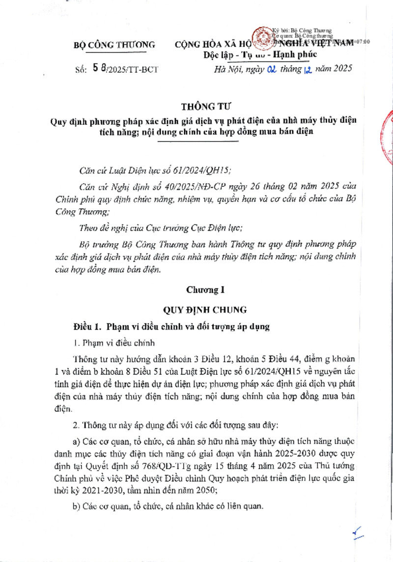 | Tiêu đề văn bản | Thông tư Quy định phương pháp xác định giá dịch vụ phát điện của nhà máy thủy điện tích năng; nội dung chính hợp đồng mua bán điện | ||